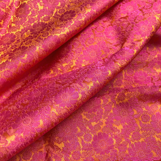 Yellow silk with Pink floral pattern fabric - Chrysanthemum Pattern