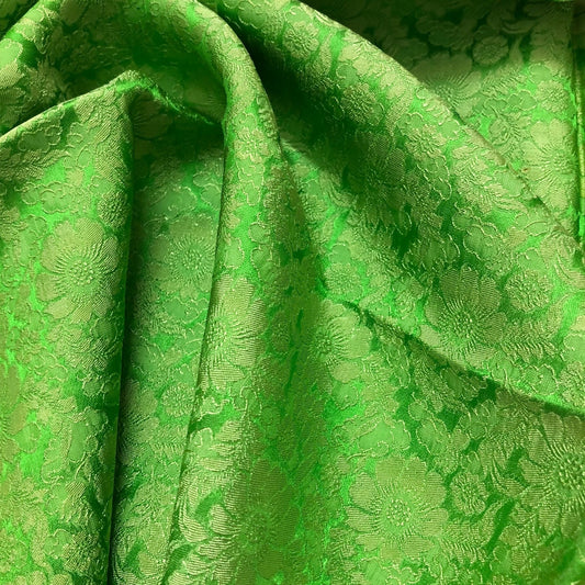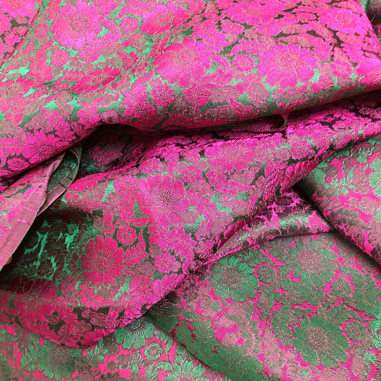 Green silk with Pink Chrysanthemum pattern - Silk for sewing - Handmade silk fabric