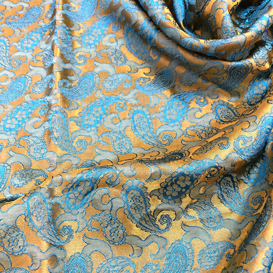 Yellow Blue fabric with mulberry peacock tails pattern, Pure mulberry silk, Handmade fabric, Organic fiber