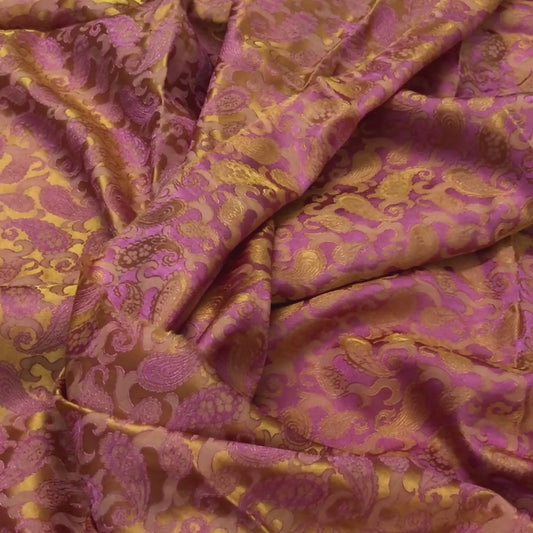 Pink Yellow fabric with mulberry peacock tails pattern, Pure mulberry silk, Handmade fabric, Organic fiber