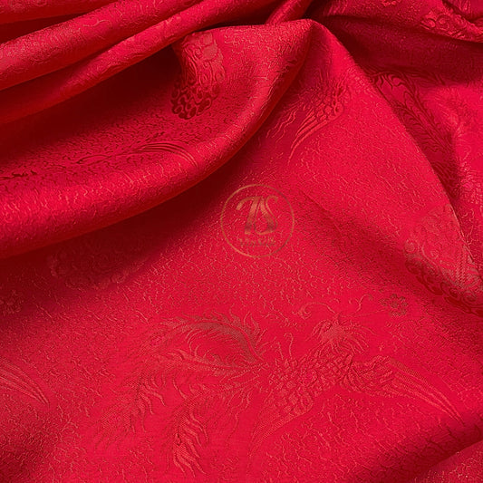 Red silk fabric with mulberry phoenix pattern, Pure mulberry silk, Handmade fabric, Organic fiber, Vintage textile