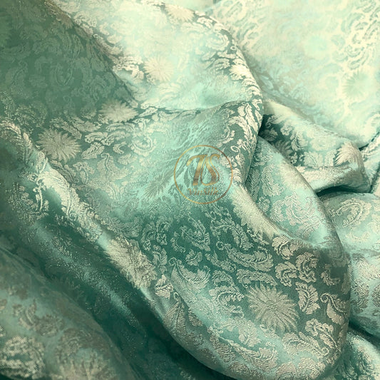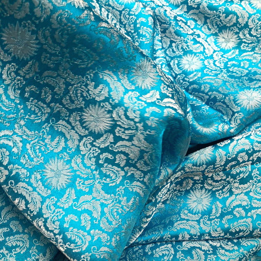 A turquoise silk fabric with mulberry leaf pattern, Pure mulberry silk, Handmade fabric, Organic fiber, Vintage textile