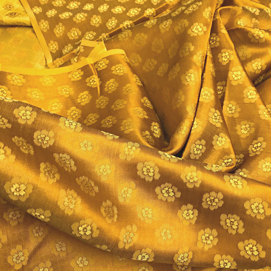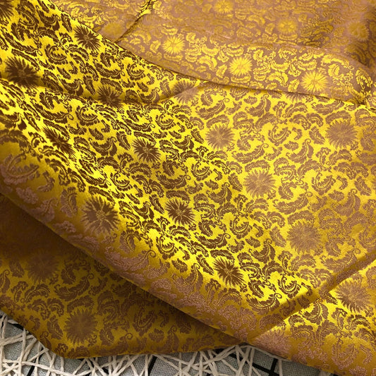 Gold silk fabric with mulberry brown chrysanthemum pattern, Pure mulberry silk, Handmade fabric, Organic fiber, Vintage textile
