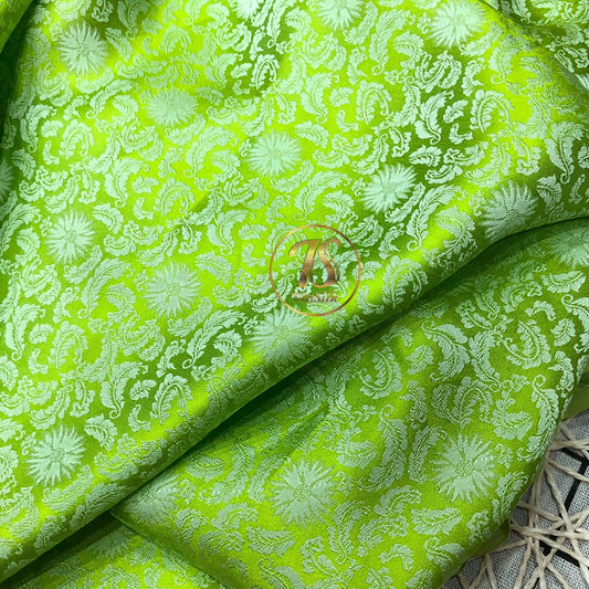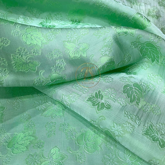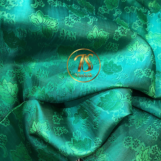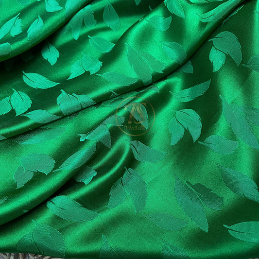 A Green silk fabric with mulberry leaf pattern, Pure mulberry silk, Handmade fabric, Organic fiber, Vintage textile