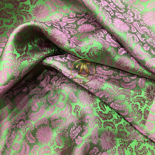 Green Pink silk fabric with mulberry chrysanthemum pattern, Pure mulberry silk, Handmade fabric, Organic fiber, Vintage textile