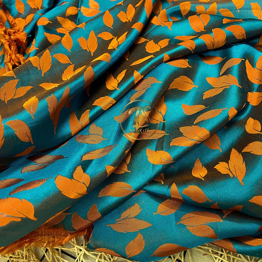 Blue silk fabric with mulberry orange leaves pattern, Pure mulberry silk, Handmade fabric, Organic fiber, Vintage textile
