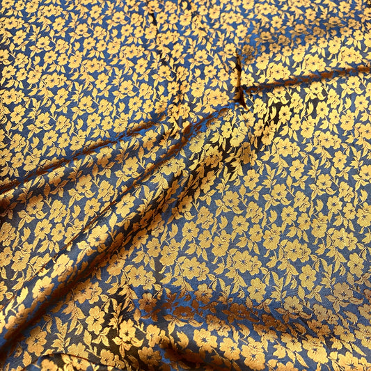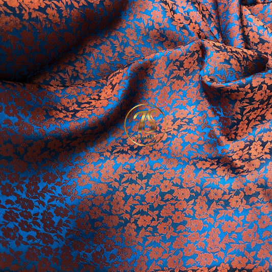 PURE MULBERRY SILK fabric by the yard - Blue silk with orange floral pattern fabric - Handmade silk – Dress making – Silk for sewing - Silk apparel fabric