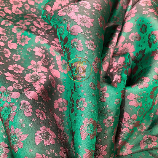 PURE MULBERRY SILK fabric by the yard - Green silk with pink floral pattern fabric - Handmade fabric – Dress making – Silk for sewing - Gift for women