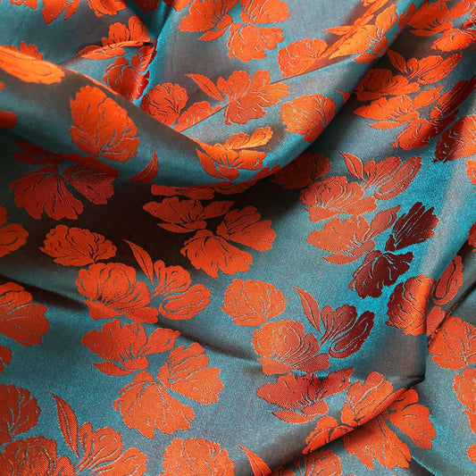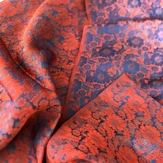 Mulberry Silk Floral Fabric – Chrysanthemum Pattern – Silk for Sewing - Dress making - Orange and blue silk fabric