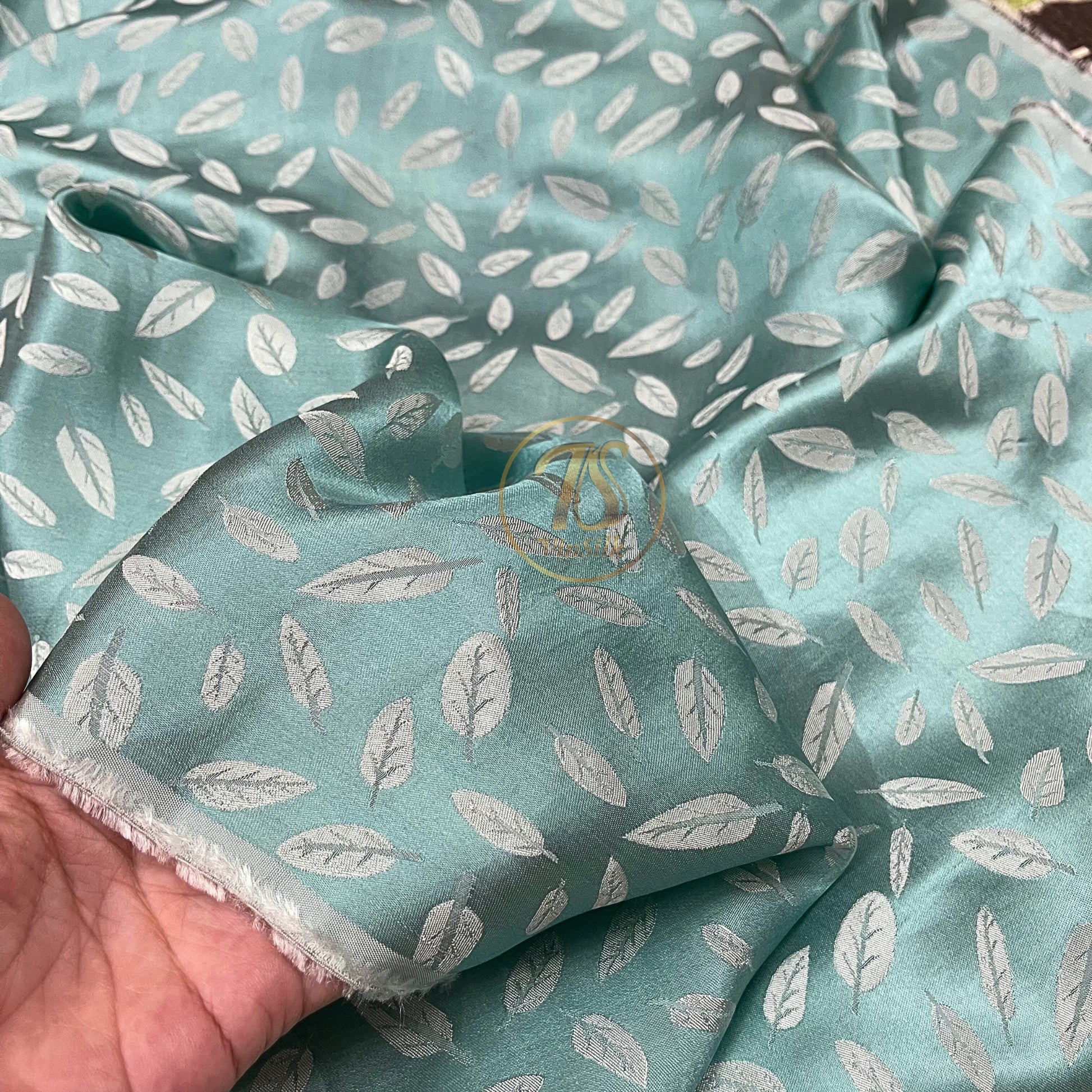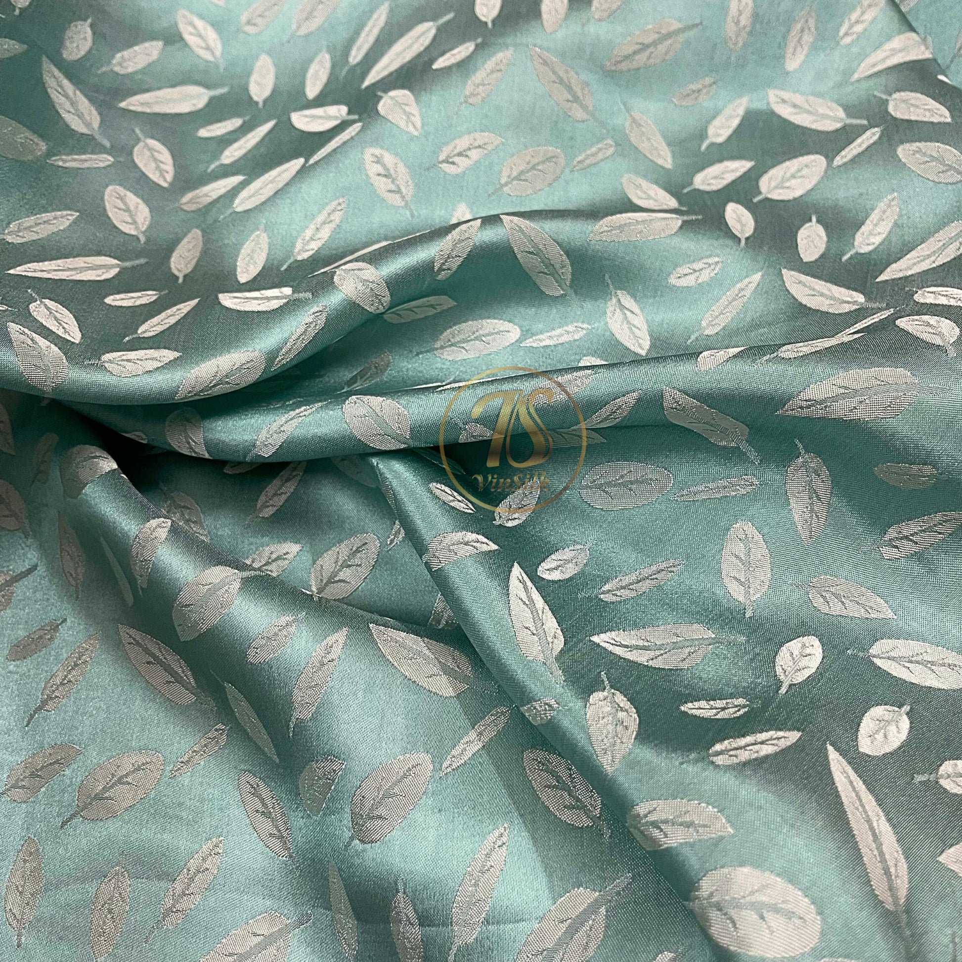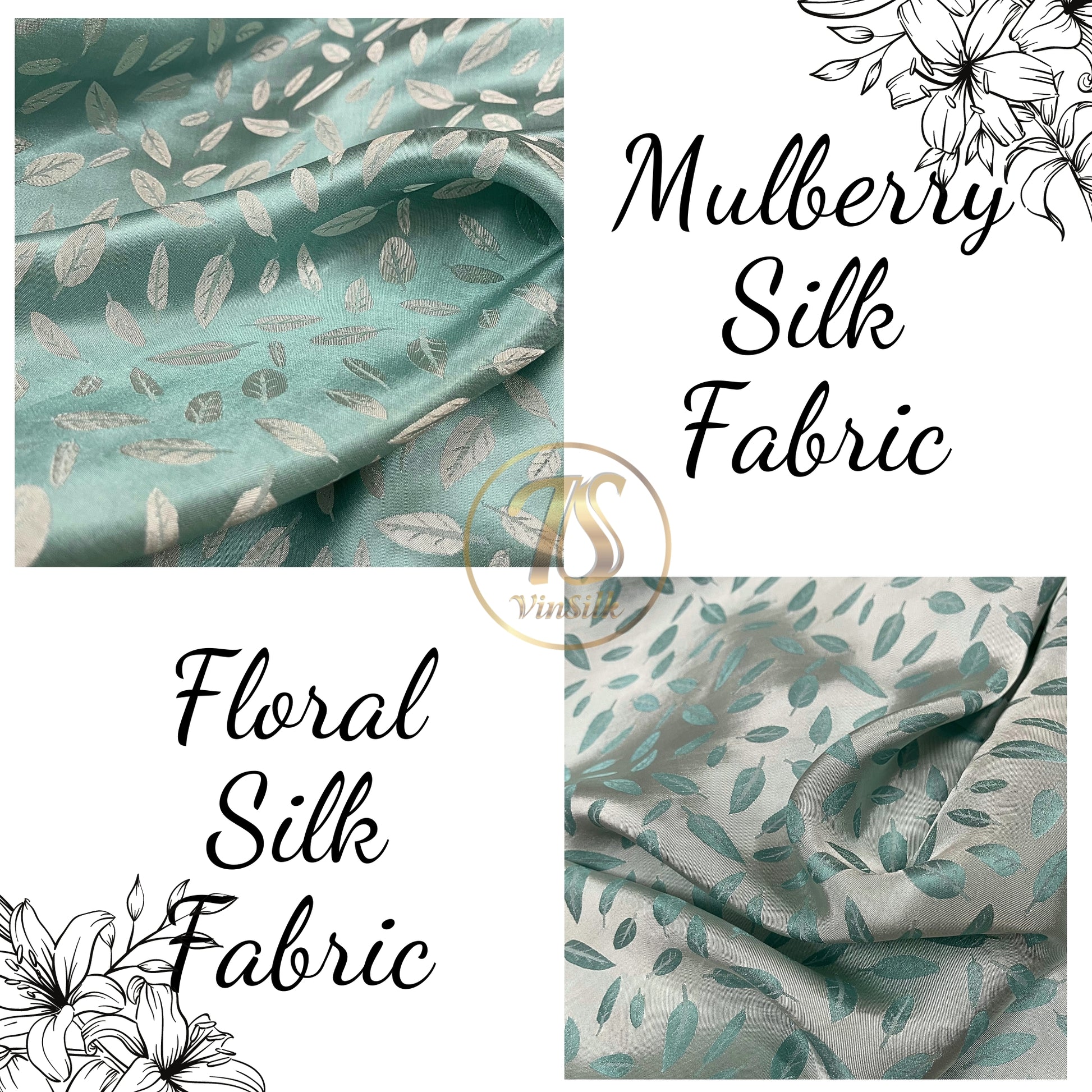 blue silk fabric with mulberry white leaves pattern, Pure mulberry silk, Handmade fabric, Organic fiber, Vintage textile
