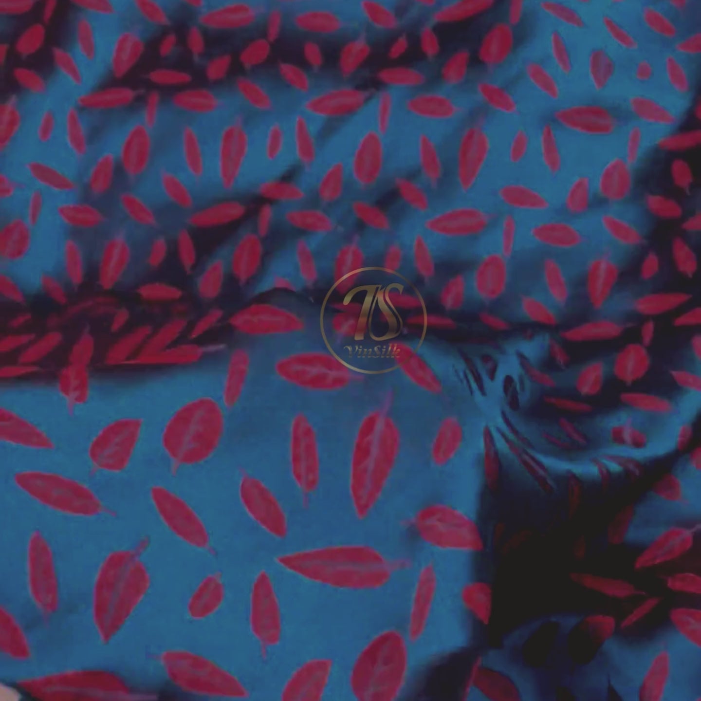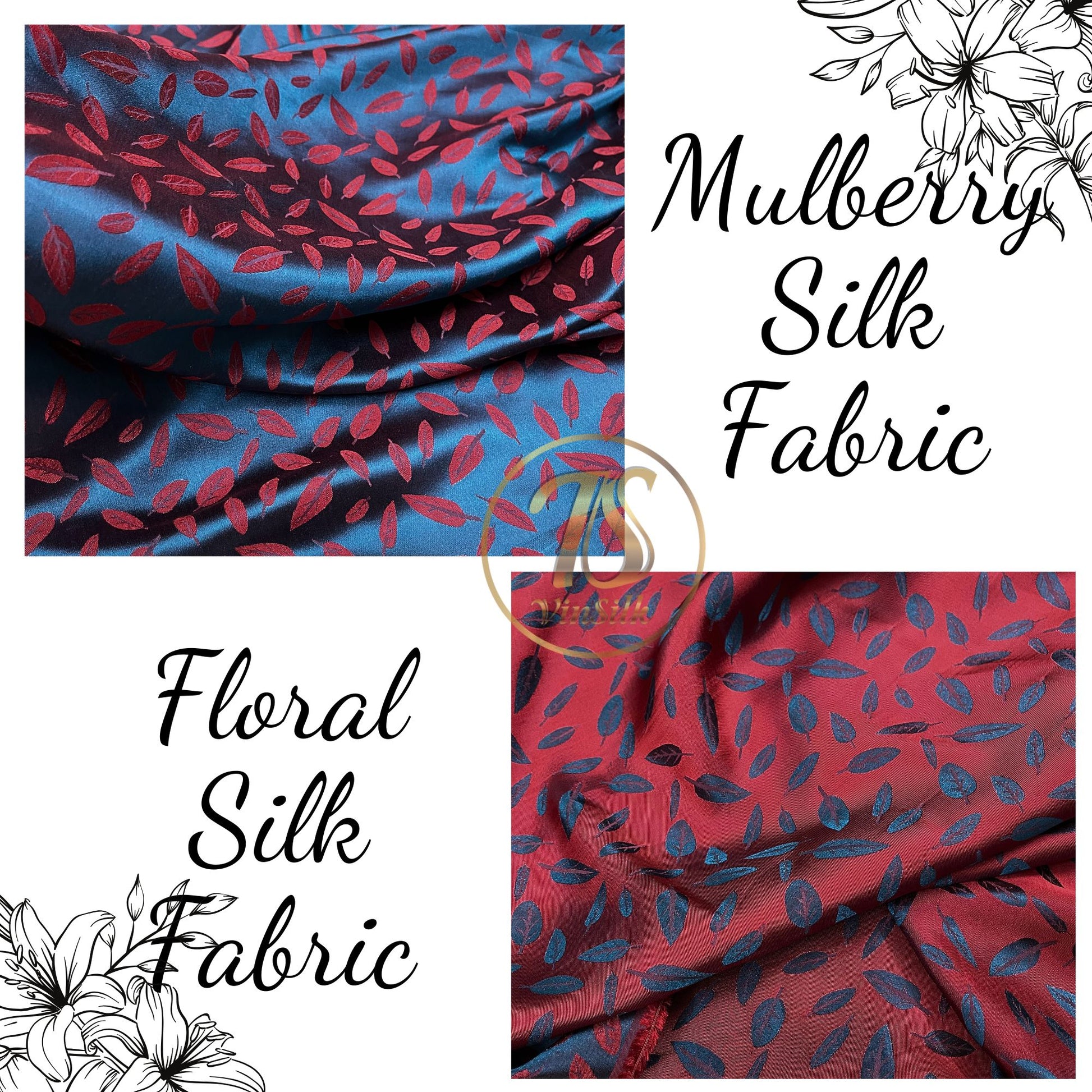 Blue silk with red leaf pattern fabric, Pure mulberry silk, Handmade fabric, Organic fiber, Vintage textile, Dress making, Gift for women, Silk dress