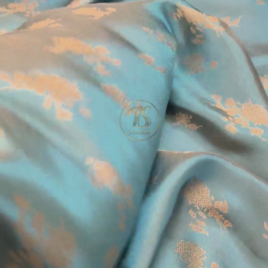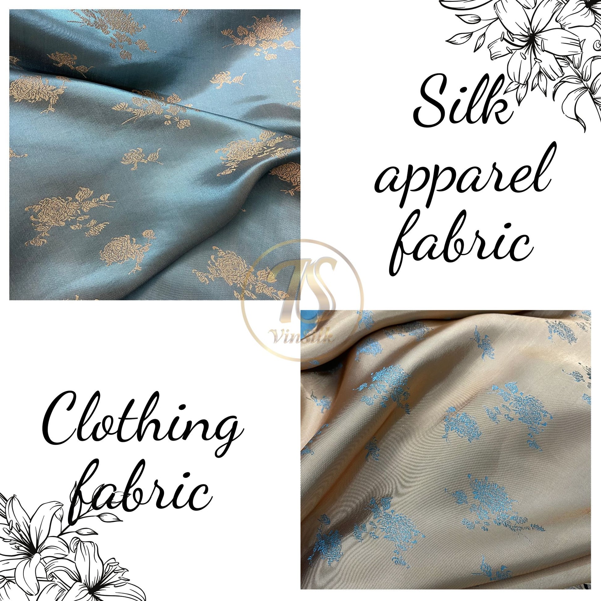 Blue silk with yellow flower pattern fabric, Pure mulberry silk, Handmade fabric, Organic fiber, Vintage textile, Dress making, Gift for women, Silk dress, fabric silk