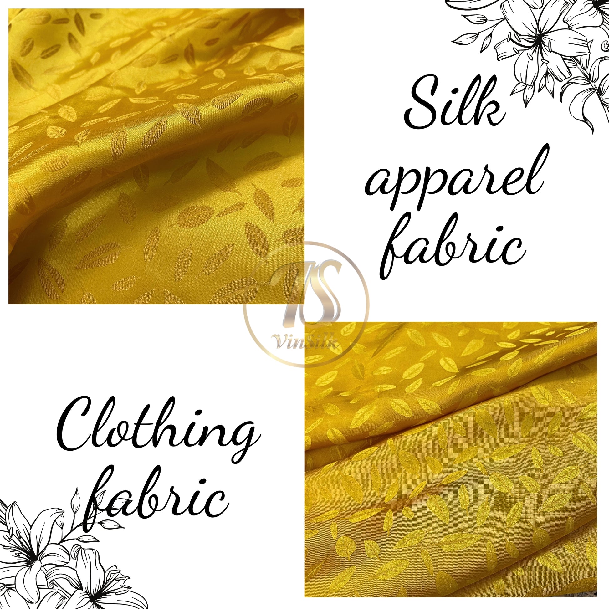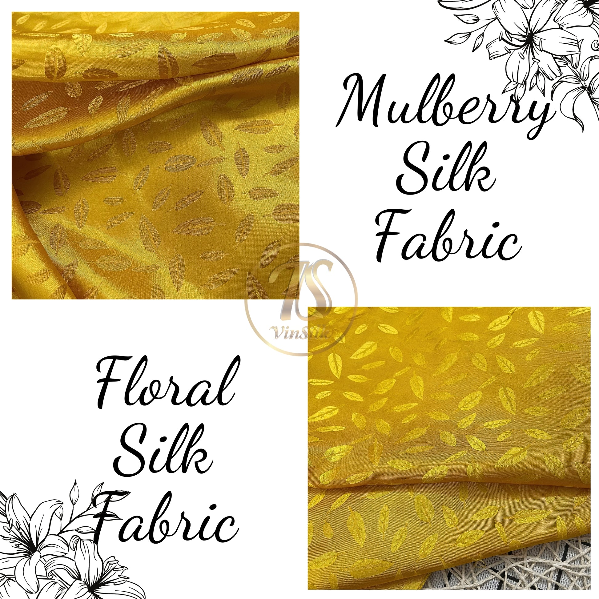 Bronze gold silk fabric with mulberry white leaves pattern, Pure mulberry silk, Handmade fabric, Organic fiber, Vintage textile