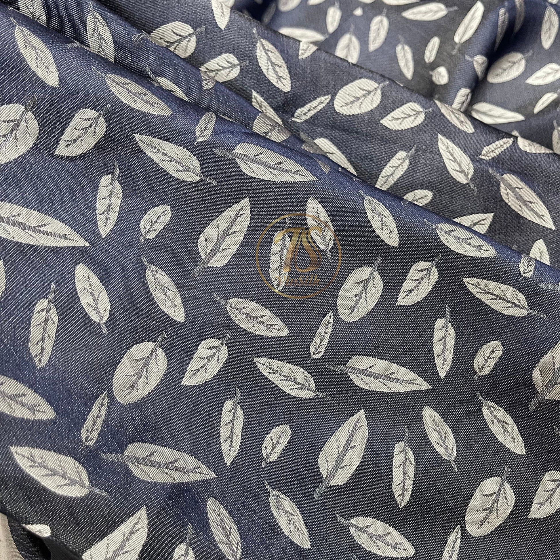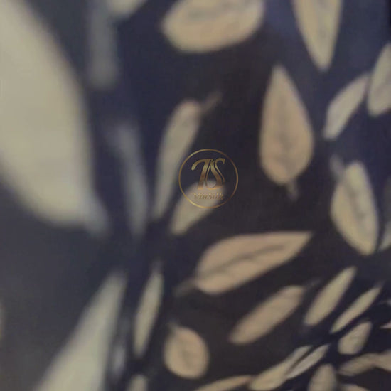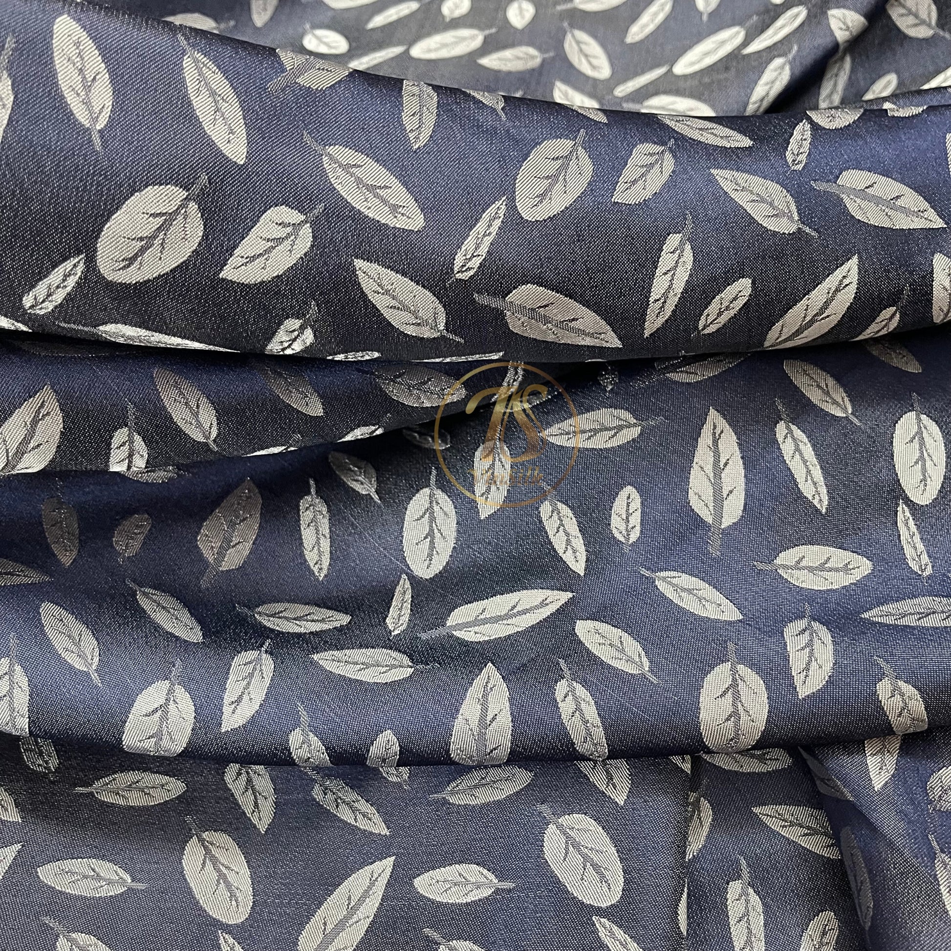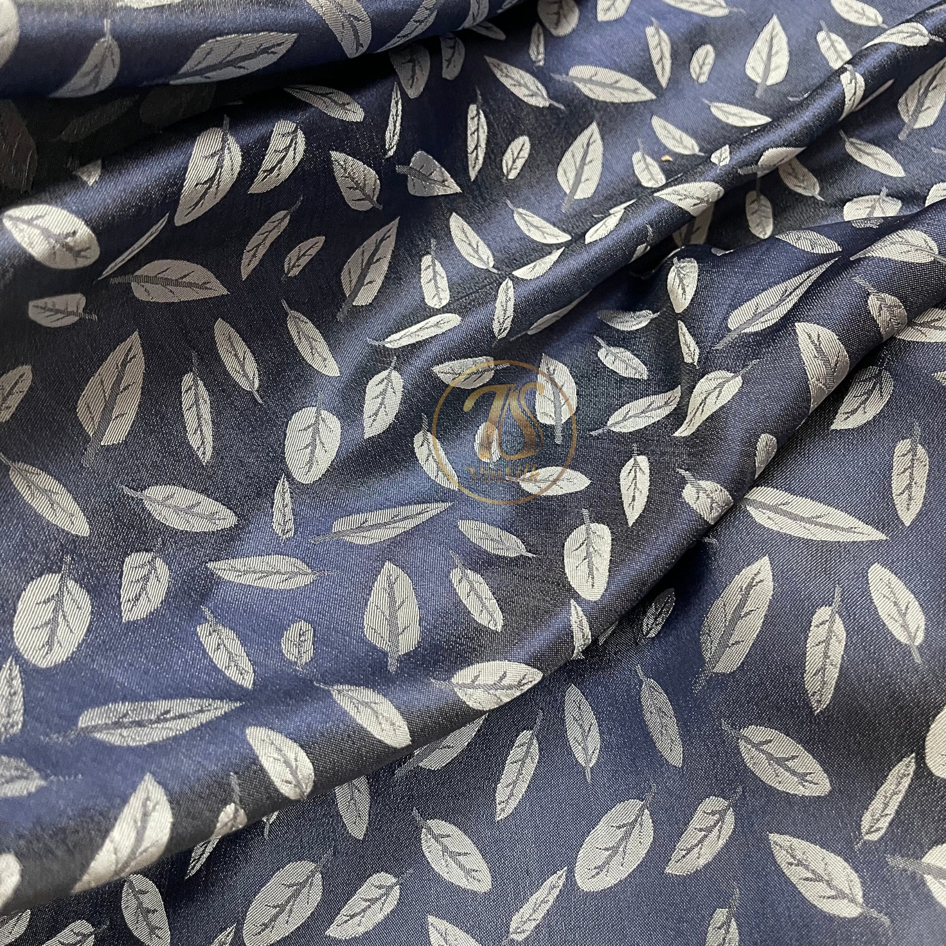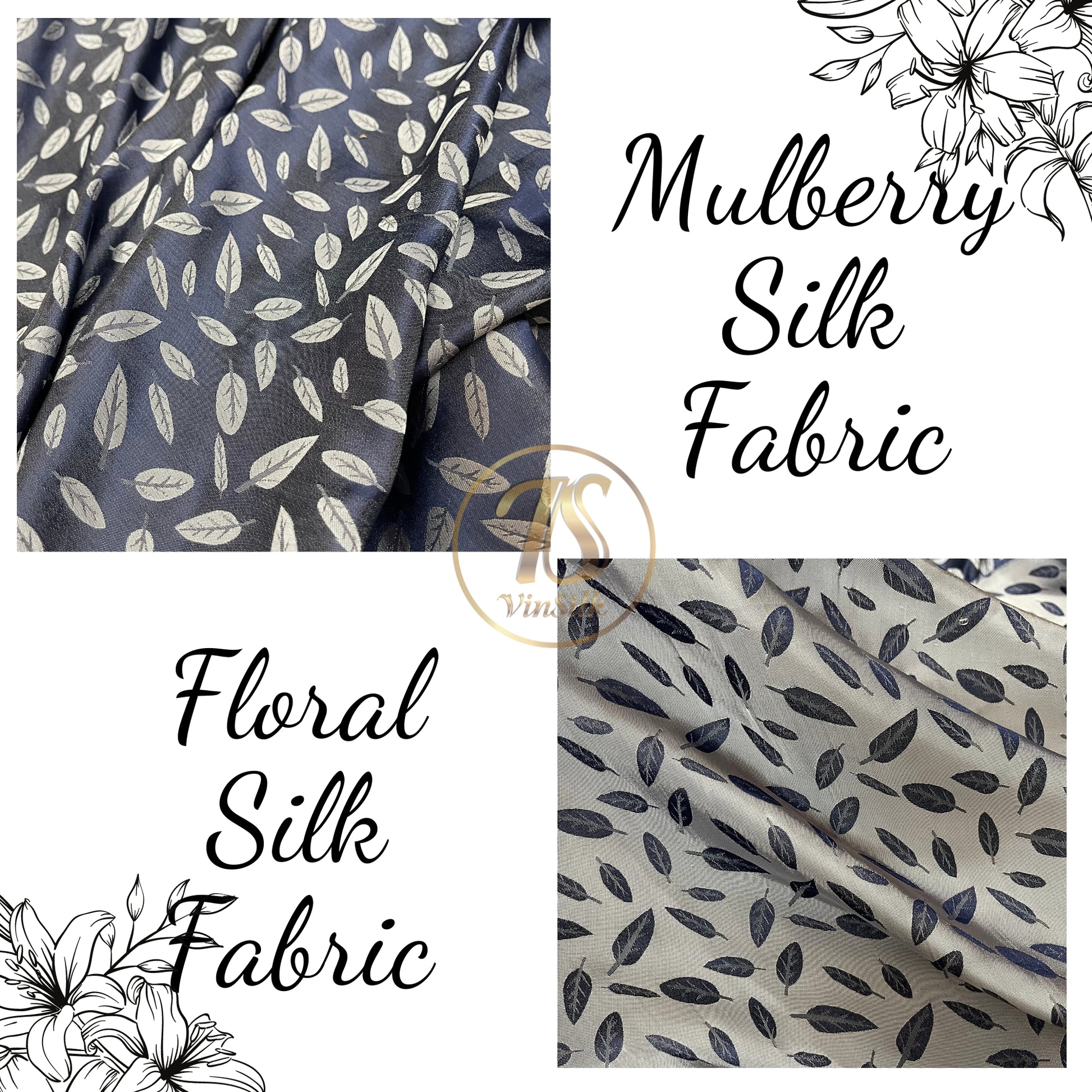 Dark Blue silk with white leaf pattern fabric, Pure mulberry silk, Handmade fabric, Organic fiber, Vintage textile, Dress making, Gift for women, Silk dress
