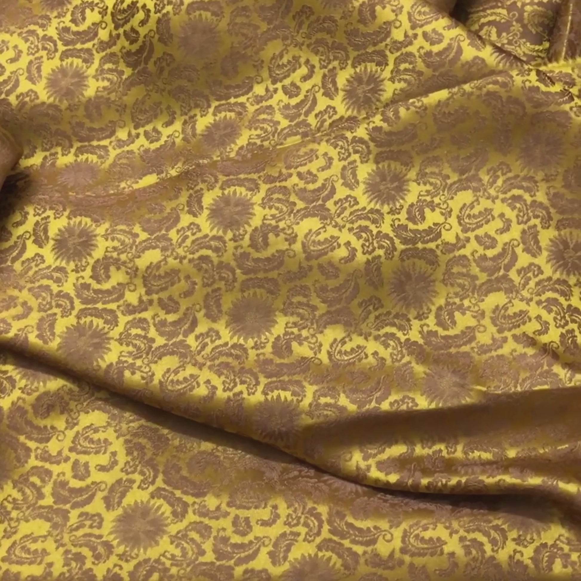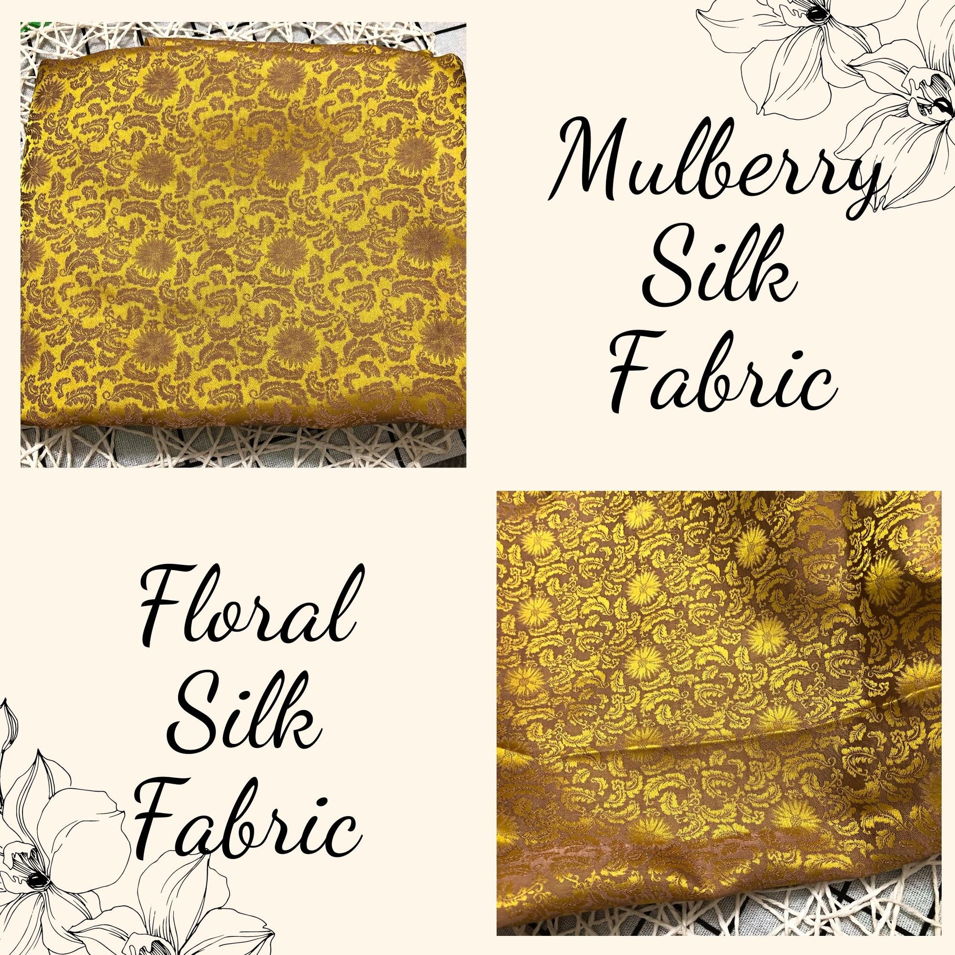 Gold silk fabric with mulberry brown chrysanthemum pattern, Pure mulberry silk, Handmade fabric, Organic fiber, Vintage textile