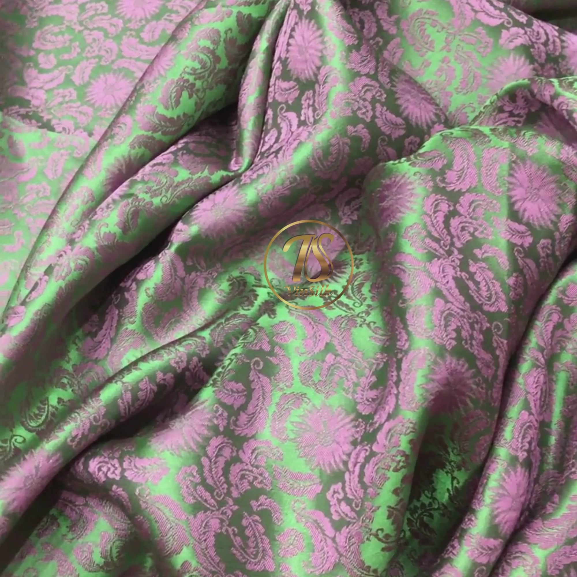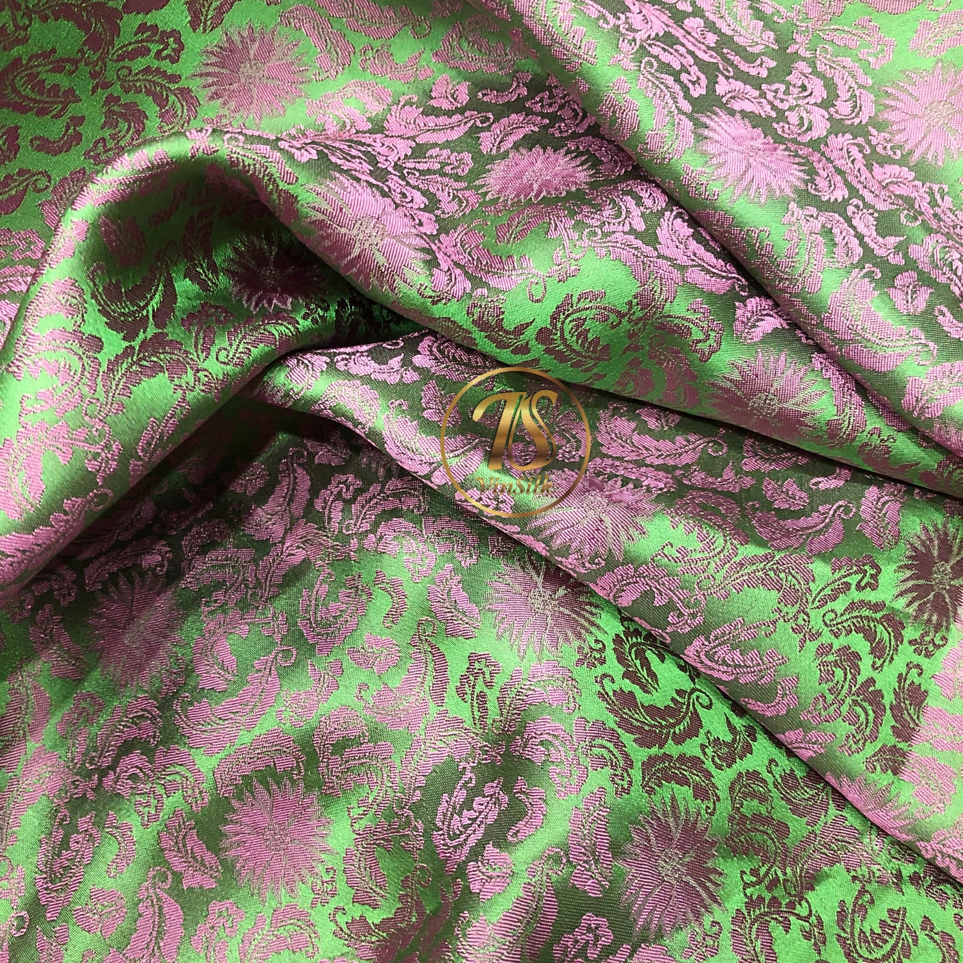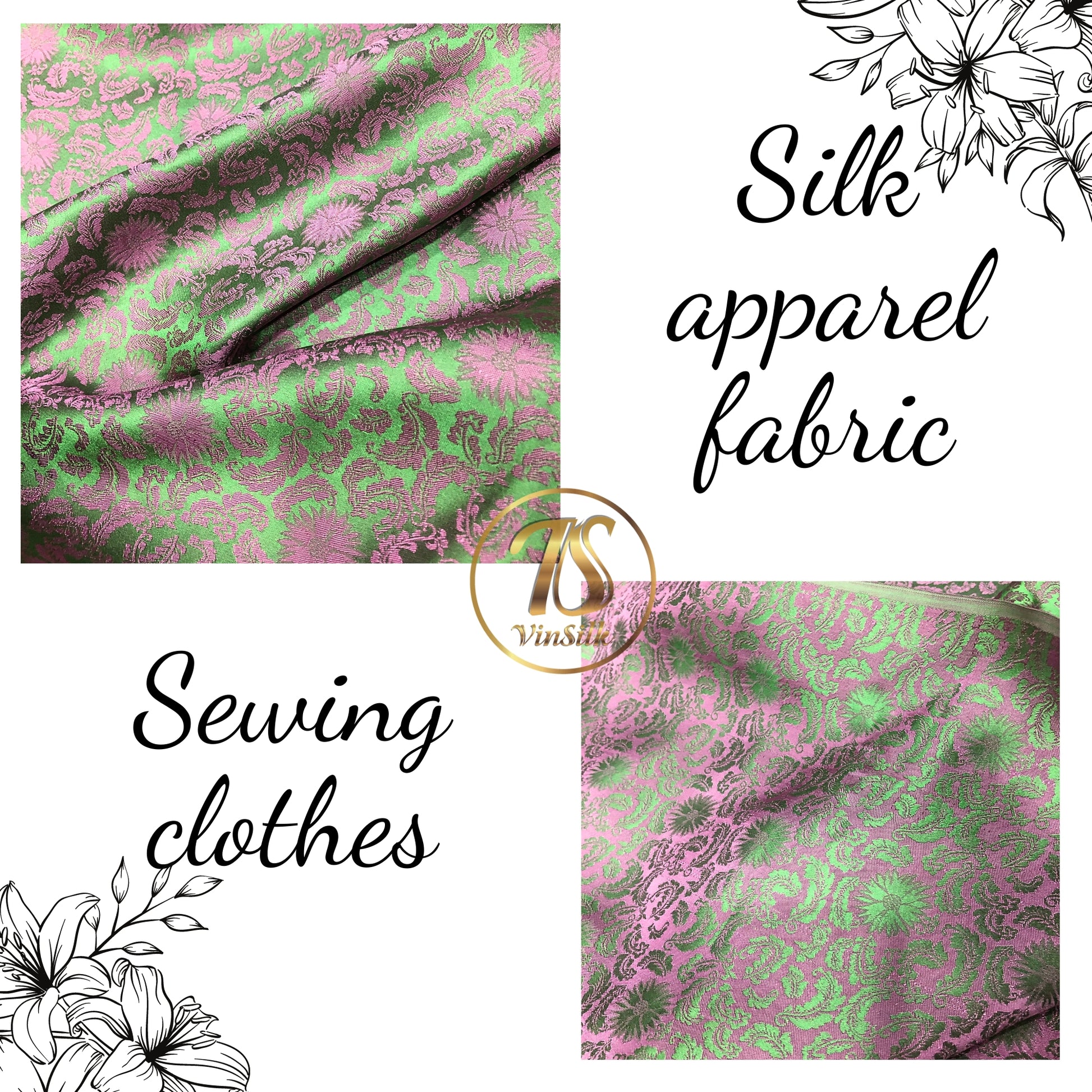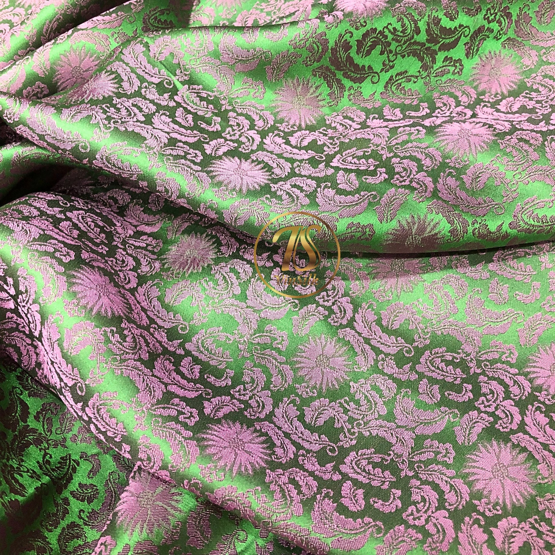 Green Pink silk fabric with mulberry chrysanthemum pattern, Pure mulberry silk, Handmade fabric, Organic fiber, Vintage textile