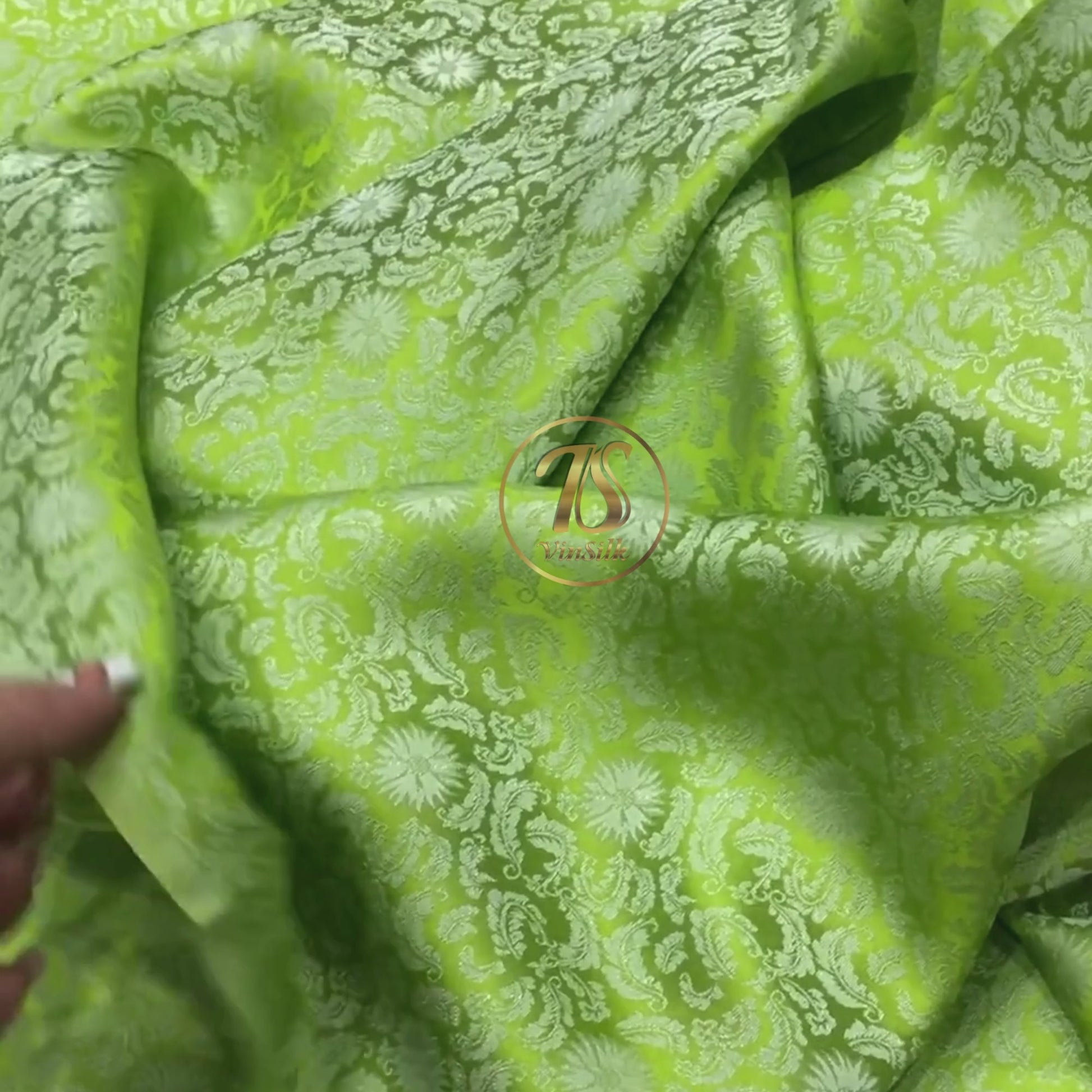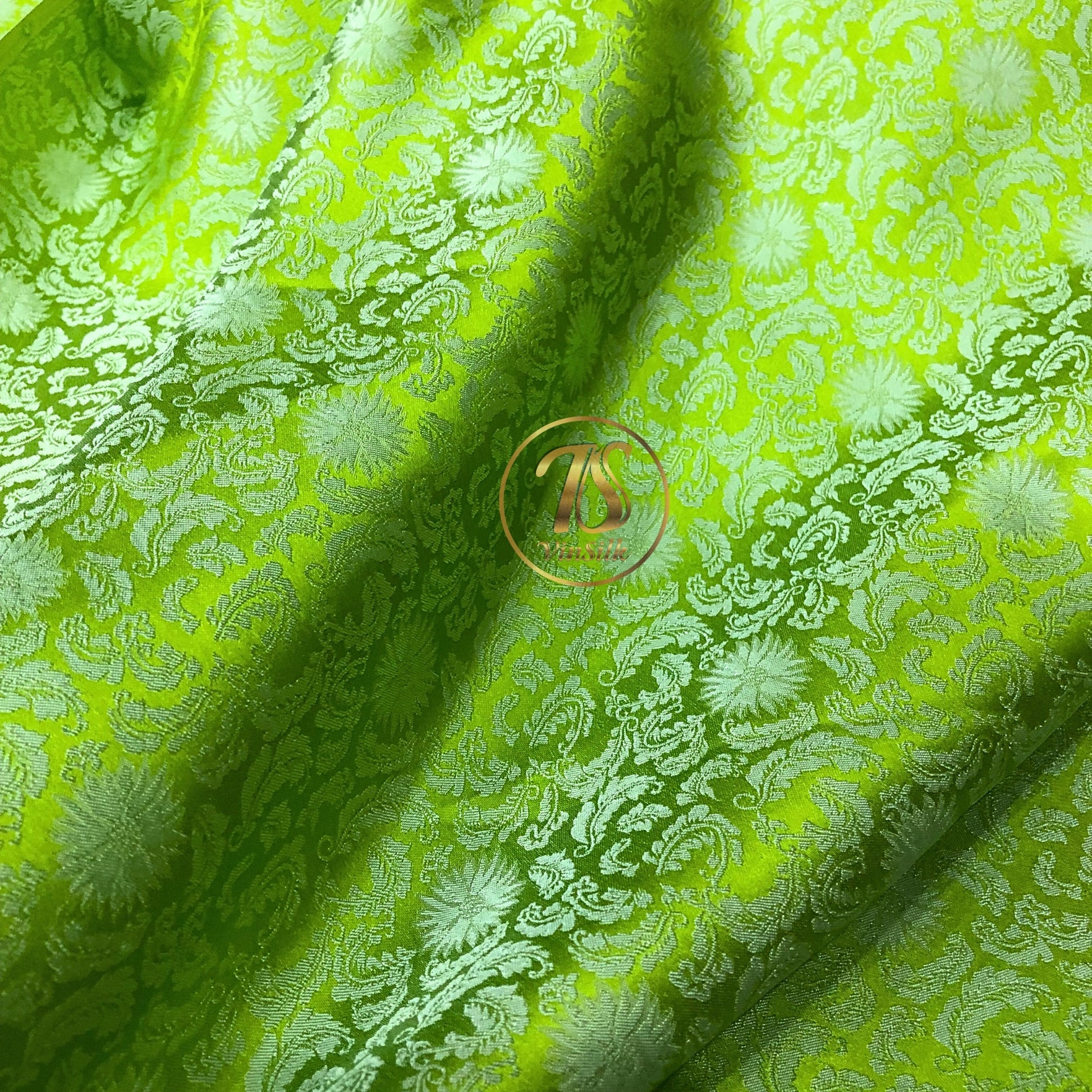 Green silk fabric with mulberry chrysanthemum pattern, Pure mulberry silk, Handmade fabric, Organic fiber, Vintage textile