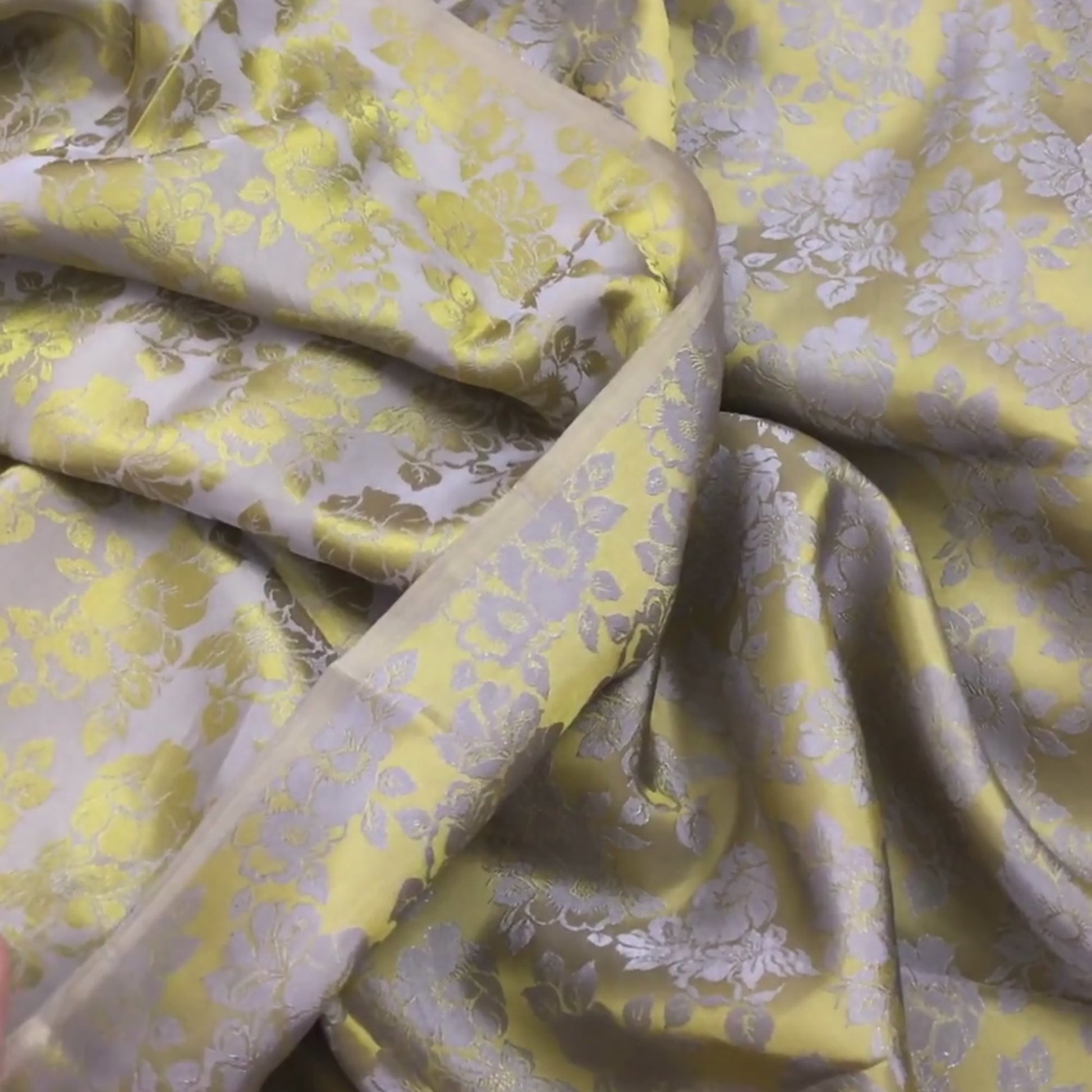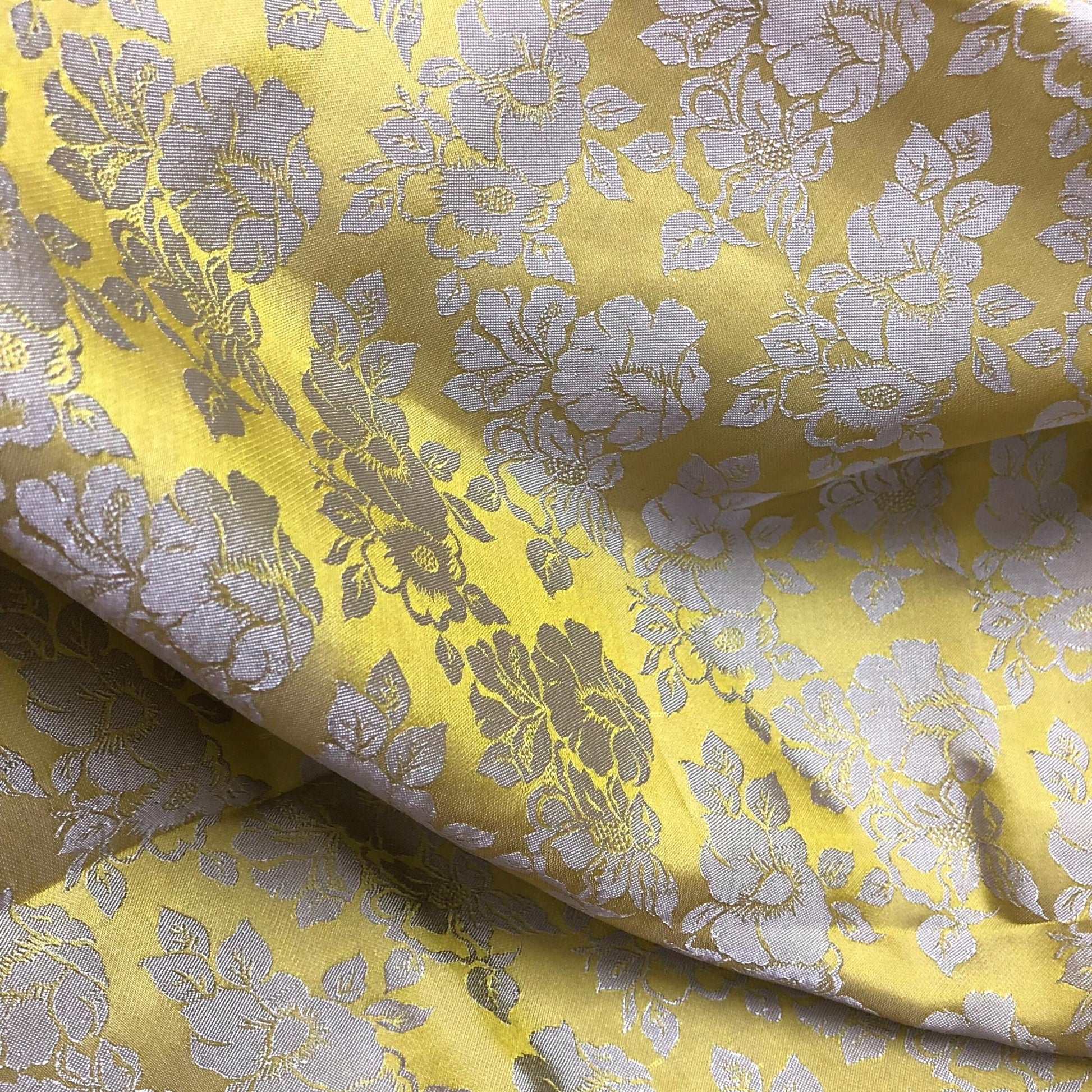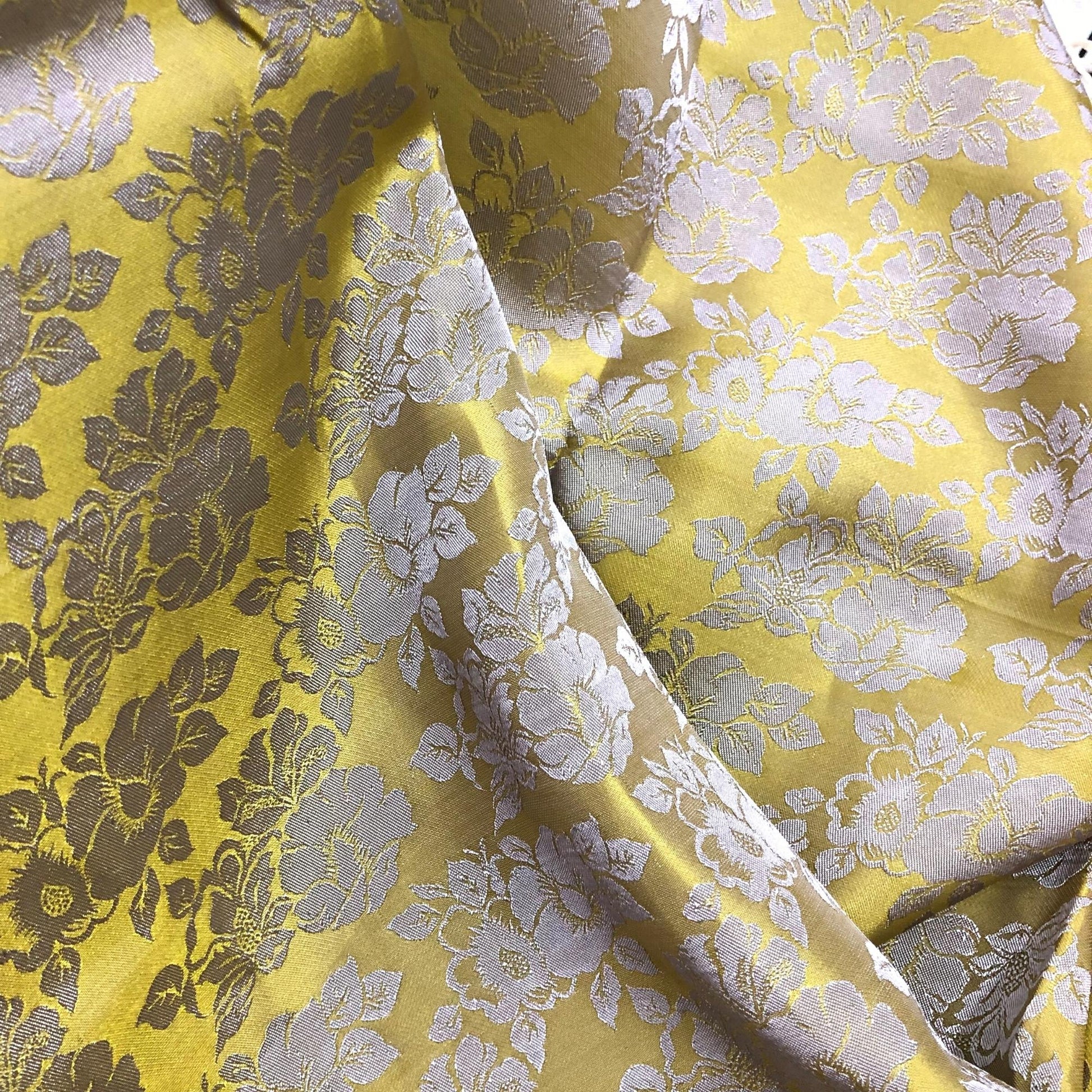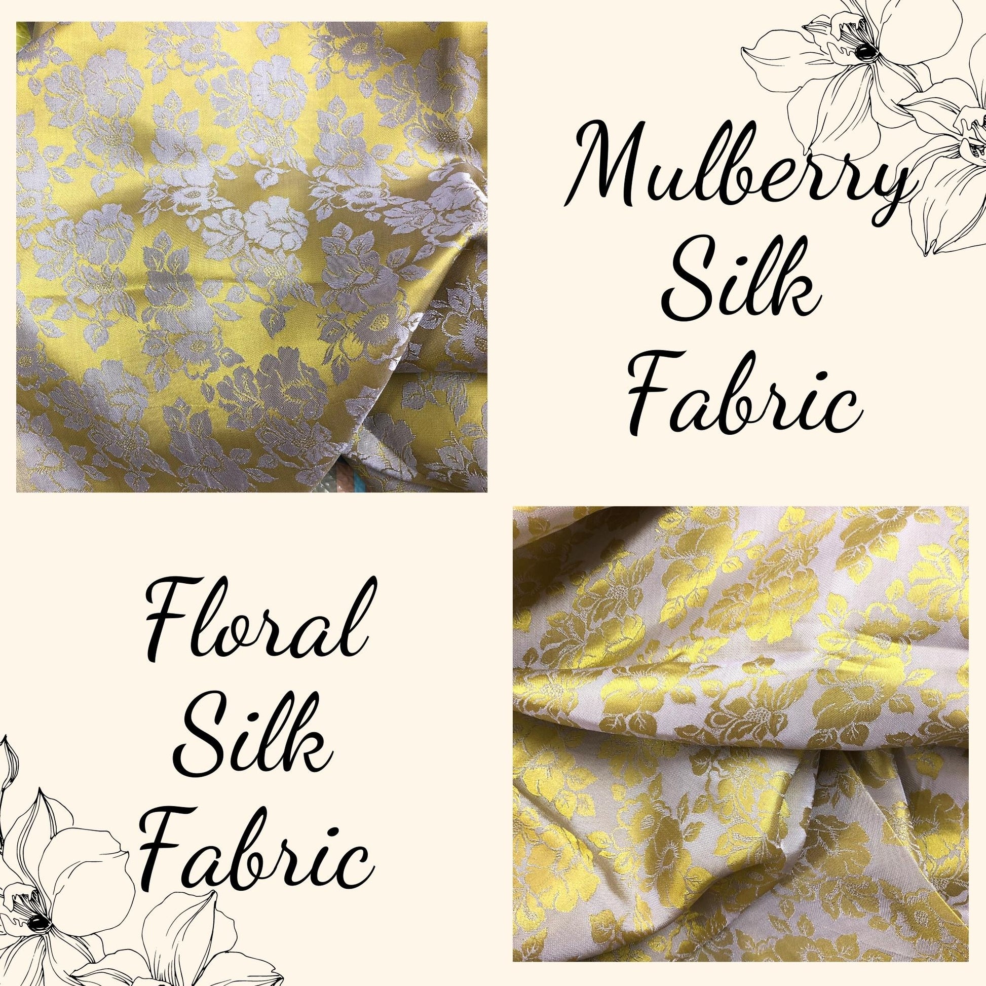 Lemon Yellow silk with rose flower pattern fabric, Pure mulberry silk, Handmade fabric, Organic fiber, Vintage textile, Gift for women
