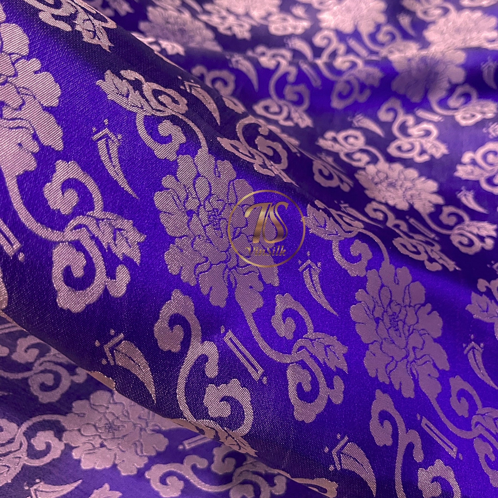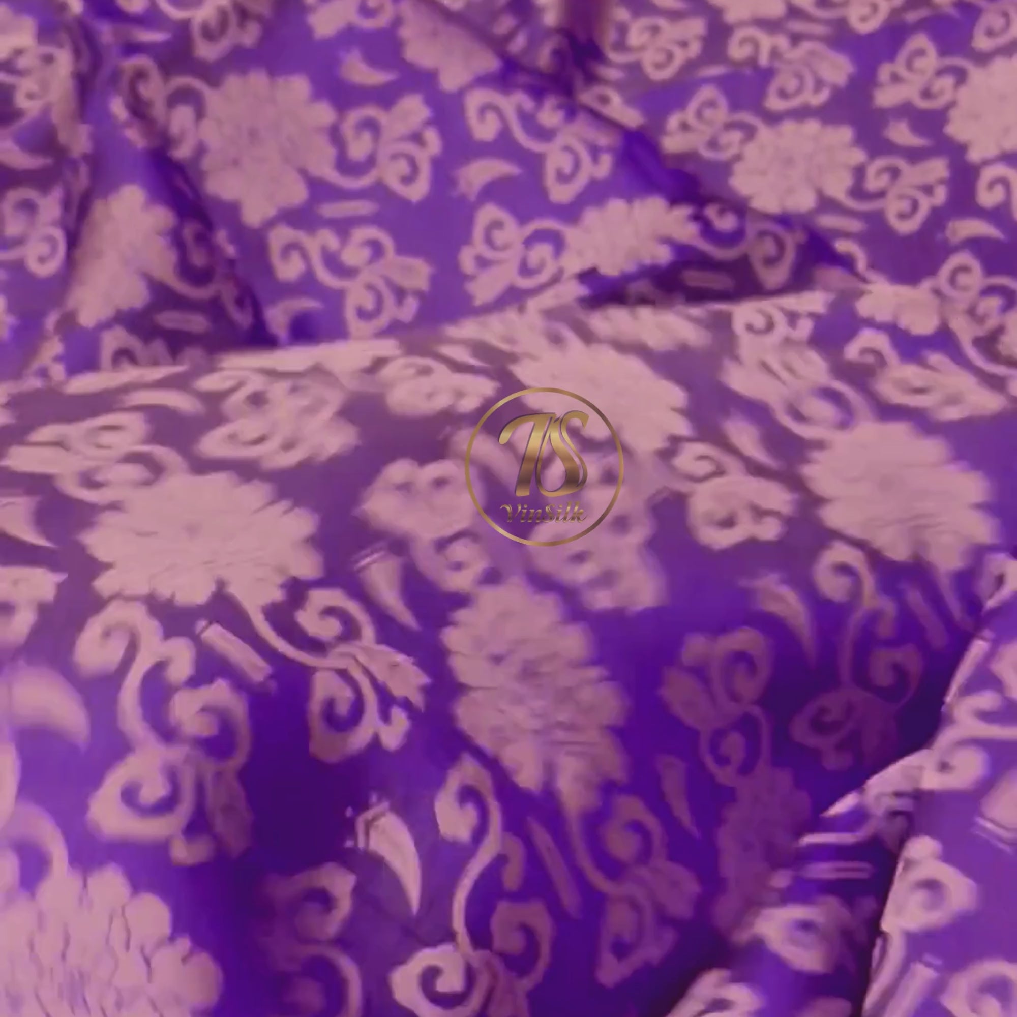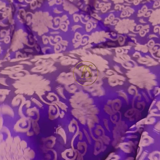 Purple silk with pink flower pattern, Floral silk fabric, Pure mulberry silk, Handmade fabric, Organic fiber