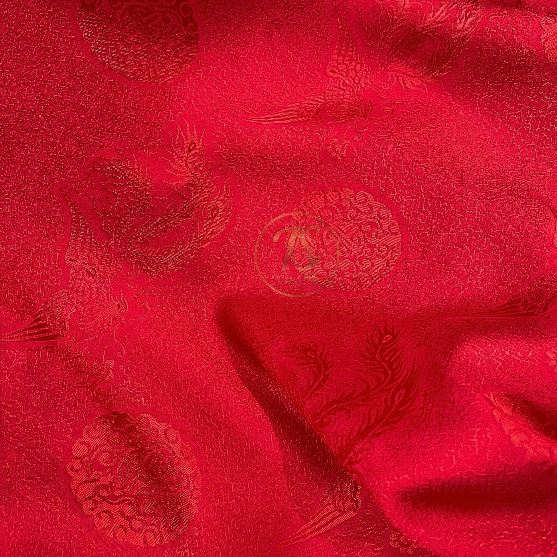 Red silk fabric with mulberry phoenix pattern, Pure mulberry silk, Handmade fabric, Organic fiber, Vintage textile